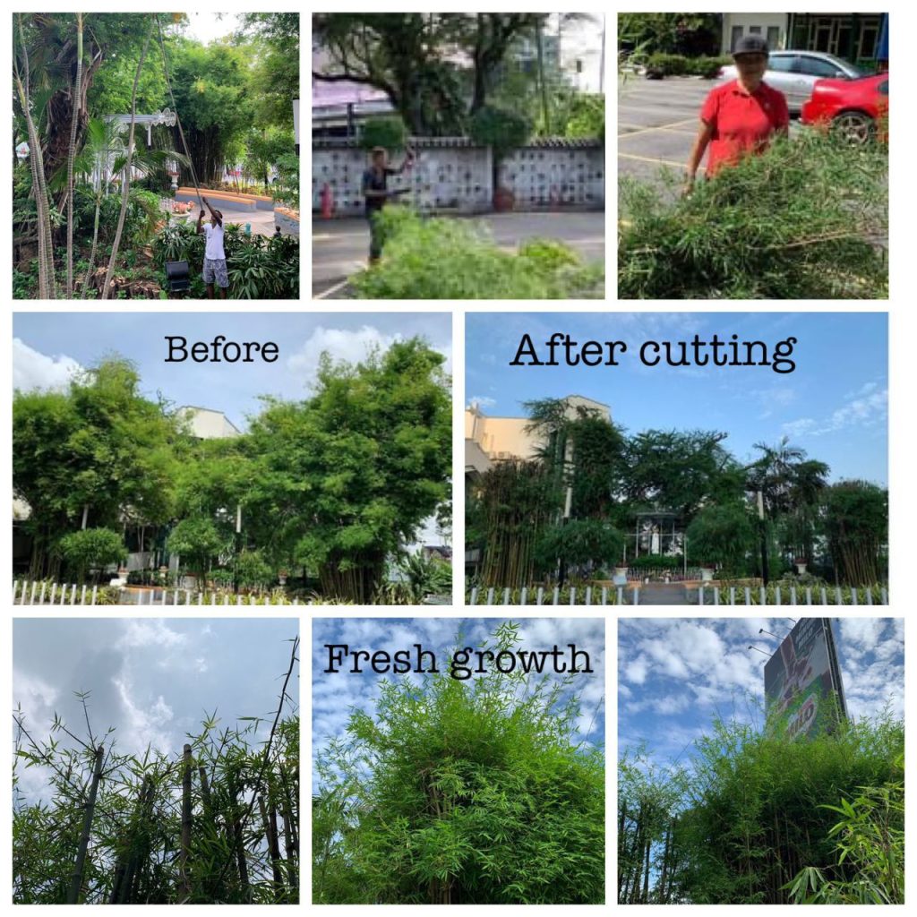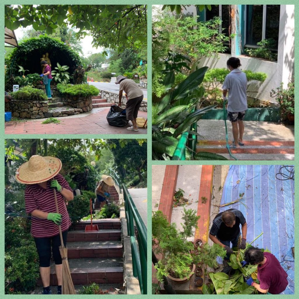 Apart from the weekly routine tasks of sweeping, clearing, trimming, watering, fertilising, weeding and adding leaves to compost bins, the team members also put out their own equipment from a hand blower to aid in clearing the dried leaves and even a chainsaw to cut down overgrown bamboo shoots. If unattended, the towering tree branches and bamboo grove could be a potential hazard to passing parishioners, the OLOF shrine and surrounding lights.
